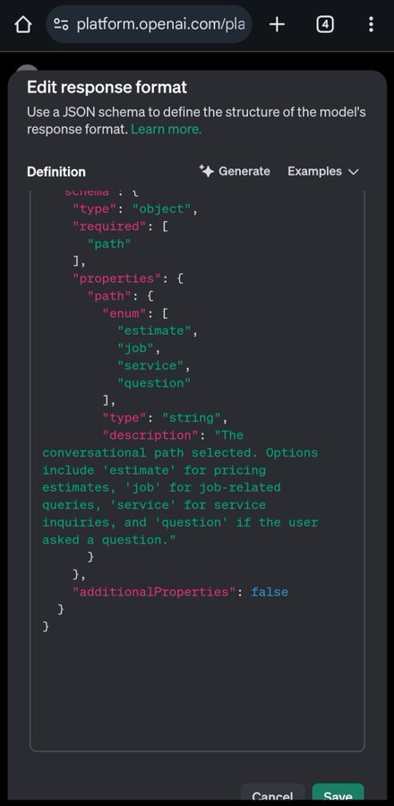 Heres a somewhat interesting use case for structured outputs. The idea is to set the conversational "path." Setting the path doesn't do anything itself but it can be used to determine what sequence of questions gets asked, for example.